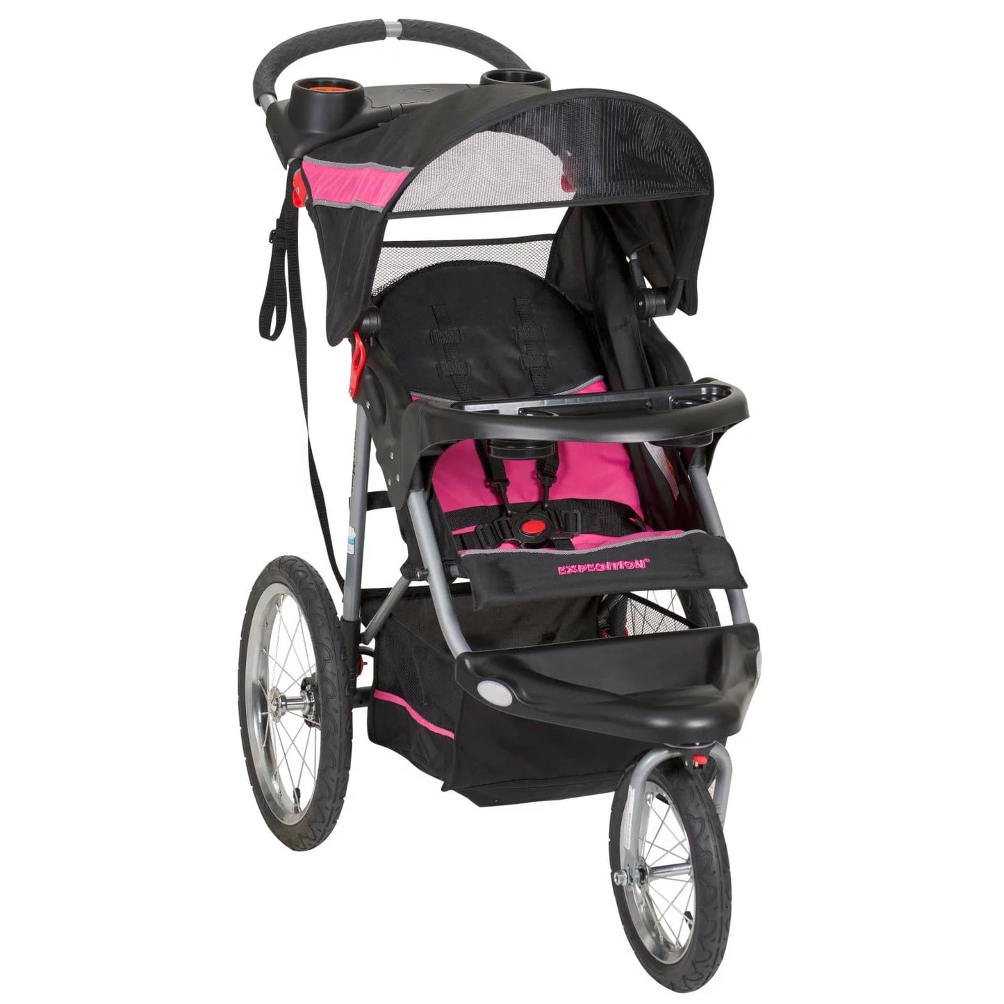 PRODUCT DESCRIPTION Equipped with adjustable, reclining, padded seat and all-terrain tires, this lightweight jogging stroller allows you to go anywhere you need with superior comfort for your baby. This Baby Trend Expedition Jogging Stroller features an extra-wide, open wheel base for exceptional stability. The locking swivel wheel allows you to lock the front wheel in place when jogging and unlock it for easy low-speed strolling. This multi-position stroller features a child tray with two cup holders and a convenient parent tray with covered storage and cup holders. With its 16" rear and 12" front all-terrain, rubber bicycle tires, this stroller is easy to push and offer a smooth and comfortable ride for years to come. Designed exceptionally with convenient features, this Baby Trend jogging stroller will satisfy any parent's desires. BRAND STORY By Baby Trend See more